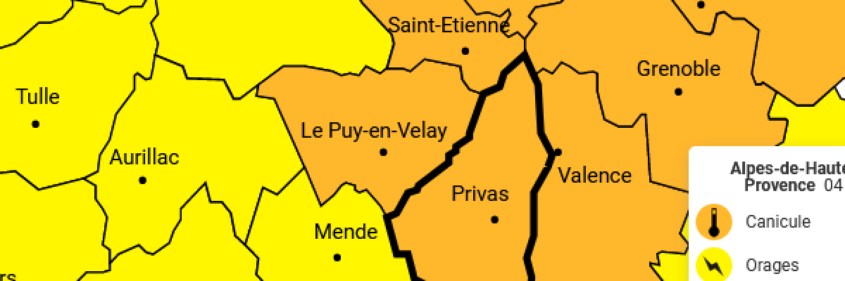 Sur les départements limitrophes et placés en vigilance jaune, les maximales seront de 32 à 35/36°C sur la Haute Loire, l’Isère et le Rhône, et jusquà 34 à 38°C sur l’Ardèche.