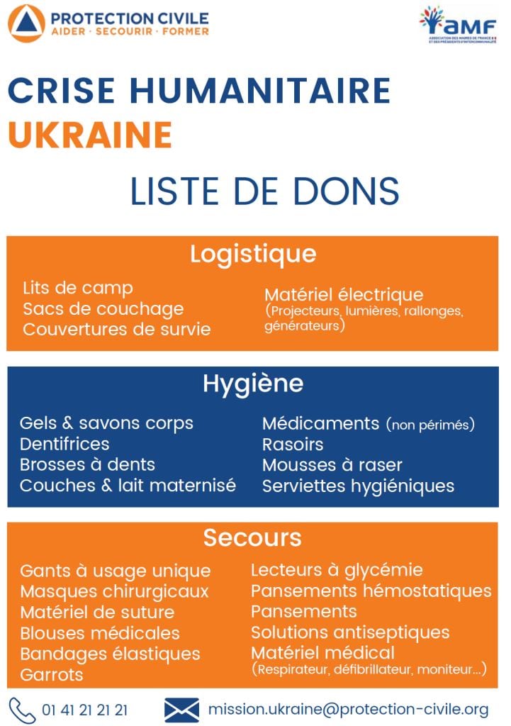 Pour les dons en argent, il faut s’adresser à la Croix-Rouge : https://donner.croix-rouge.fr/urgence-ukraine/ ou par chèque à l’attention de : « Croix-Rouge française – Urgence Ukraine » à l’adresse suivante : Croix-Rouge française, CS 20011 - 59895 Lille cedex 9