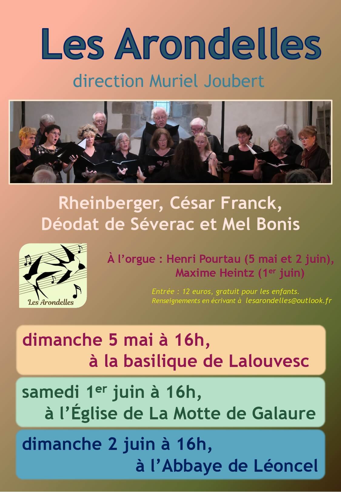 Concert Arondelle 5 mai 13 avril 2024 16h à la basilique Un concert de chœur polyphonique avec orgue aura lieu le dimanche 5 mai 2024 à la basilique à 16h. Entrée : 12 €, gratuit pour les enfants.
