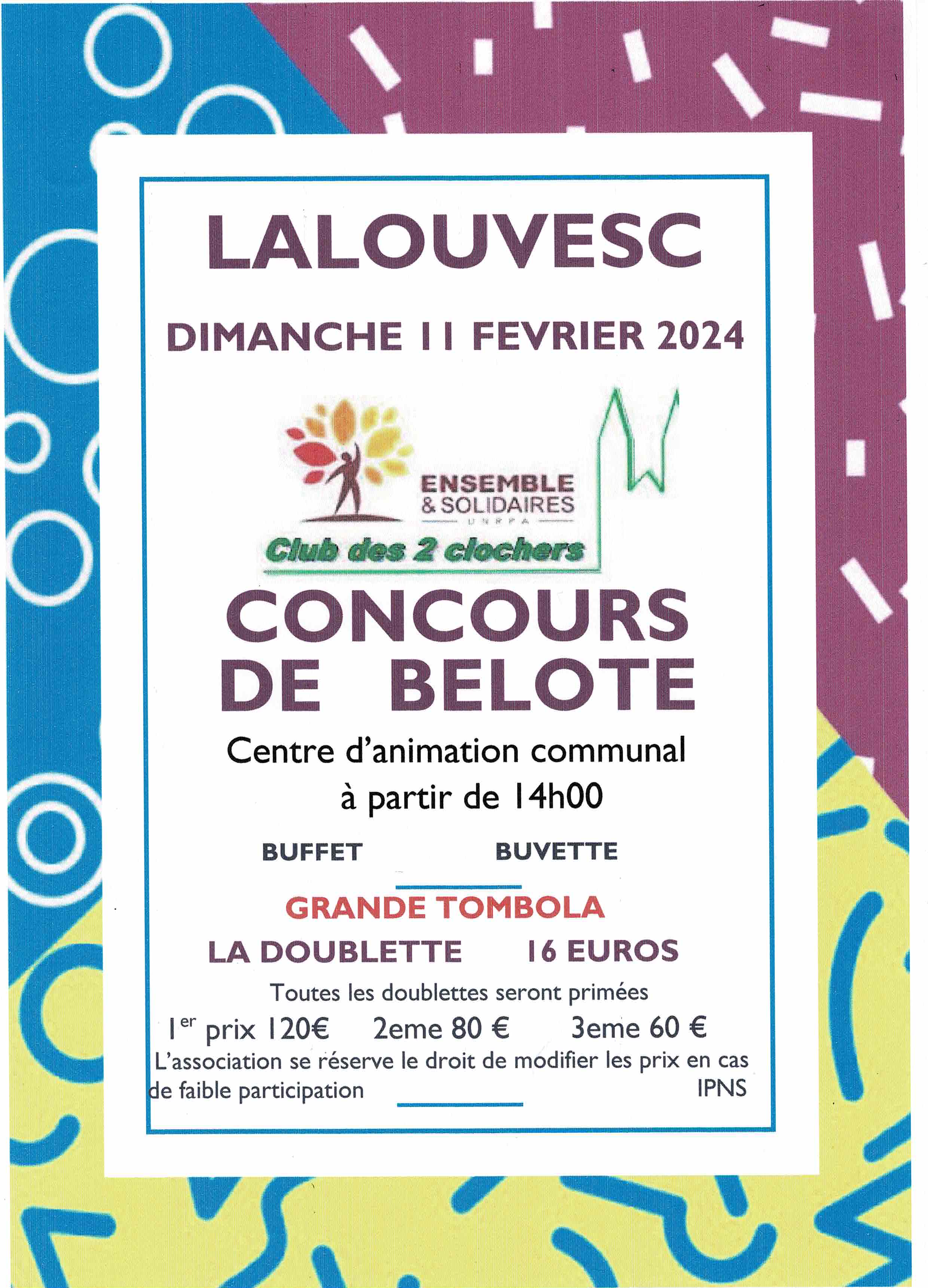 Le dimanche 11 février c’est au tour du CLUB DES DEUX CLOCHERS - ensembles et solidaires-UNRPA de vous convier à son concours de belote.