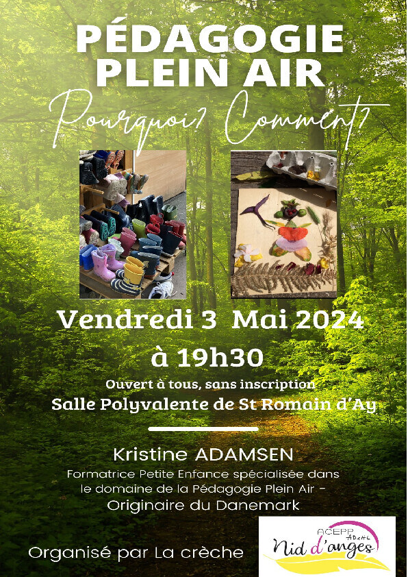 Dans le cadre de l’accompagnement à la parentalité la crèche nid d’anges organise une conférence sur la pédagogie du plein air, le 3 mai à 19h30 à la salle des fêtes de St Romain d’Ay.