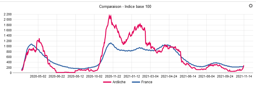 Sommes-nous à la veille d’une cinquième vague ? L’évolution des hospitalisations pour cause de Covid-19 en Ardèche est préoccupante (en rouge sur le graphique ci-dessous). Nous sommes en tendance passé au dessus de la moyenne nationale (en bleu) pour la première fois depuis mars dernier avec 33 hospitalisations, soit le double d’il y a une semaine.