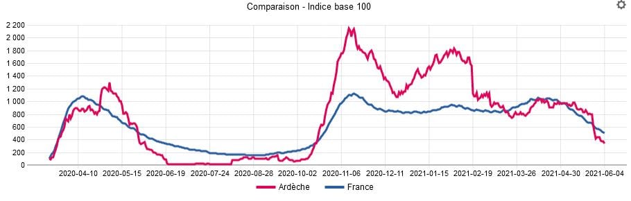Ci-dessous l’évolution du nombre des hospitalisations dues au Covid en Ardèche comparée à celle de la France entière.