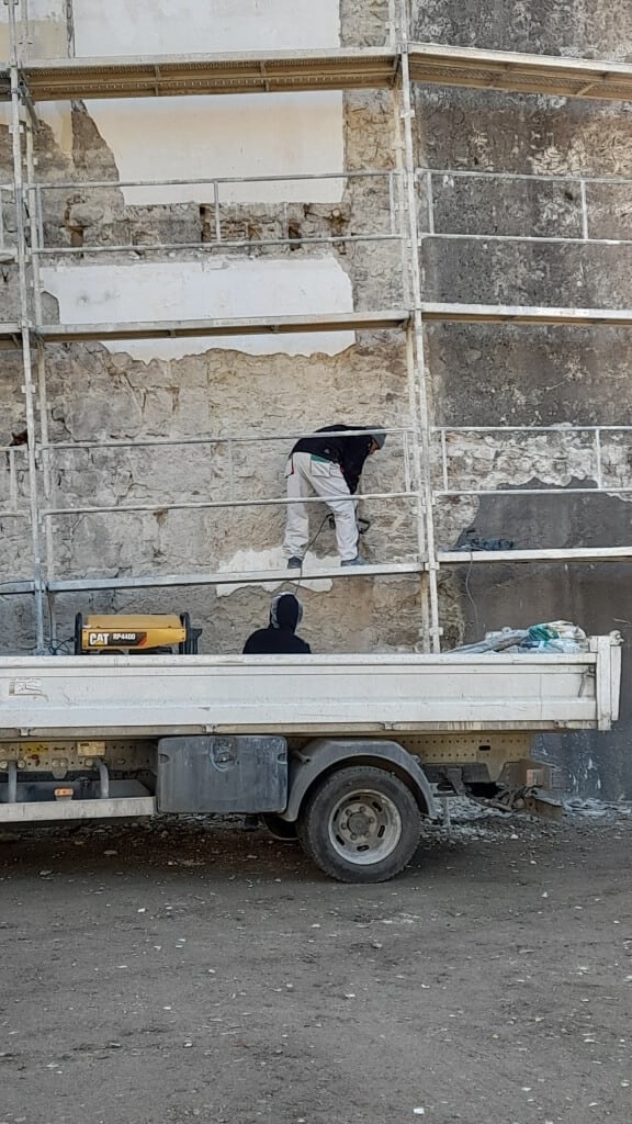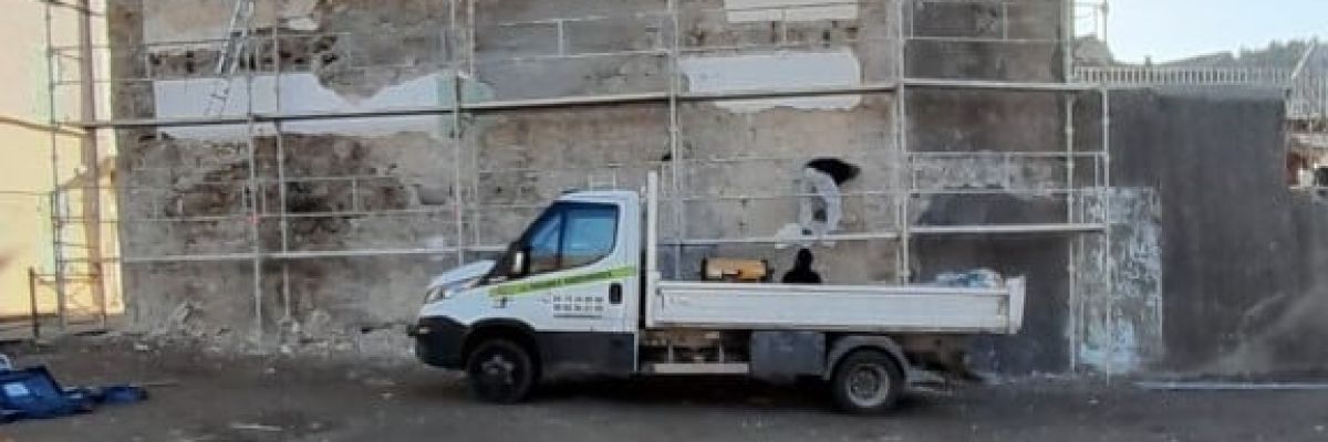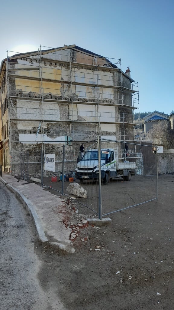 Les travaux ont repris sur l’espace Beauséjour avec la mise en place d’un échafaudage devant la façade restante et son piquetage.