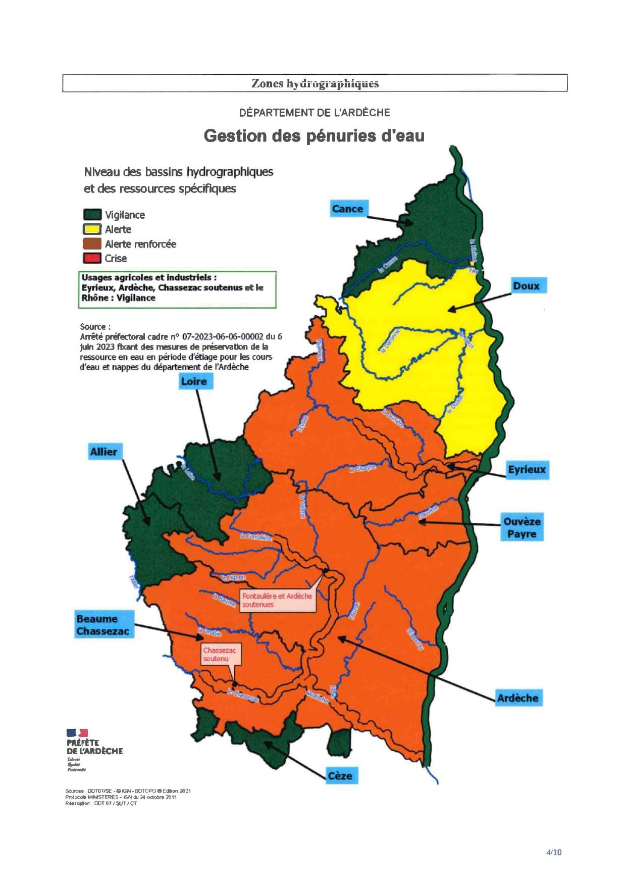 La préfecture a placé les bassins versants du Doux - Ay en niveau 2 alerte (sur 4 niveaux). Cette situation correspond au niveau d’alimentation des cours d’eau en dessous duquel la coexistence de tous les usages et le bon fonctionnement du milieu aquatique ne sont plus assurés dans des conditions satisfaisantes.