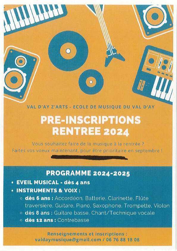 Ecole de musique du Val d'Ay : préinscriptions 20 juillet 2024 Si votre enfant souhaite une initiation à un instrument de musique, contactez l’école de musique pour le préinscrire en vue de la rentrée prochaine.