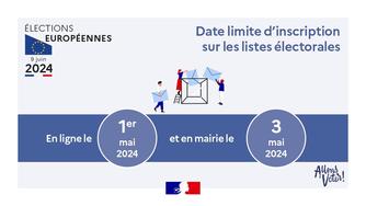 Les élections européennes 2024 auront lieu le dimanche 9 juin 2024. Inscrivez-vous sur les listes électorales avant le 1er mai 2024 (en ligne) ou le 3 mai 2024 (à la mairie).
