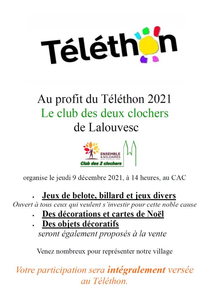 Le jeudi 9 décembre a 14h, Le Club des deux clochers organise au CAC : belote et jeux divers au profit du Téléthon