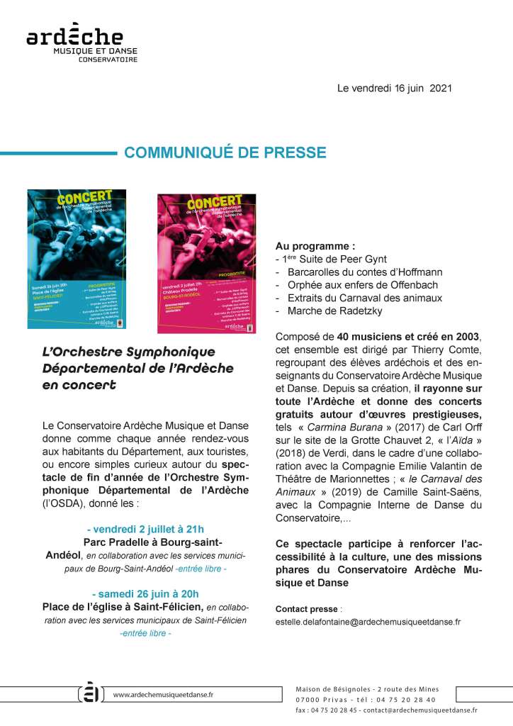 L'orchestre philarmonique départemental de l'Ardèche en concert les 26 juin et 6 juillet 15 juin 2021 Place de l'église à St Félicien le 26 juin, concert gratuit