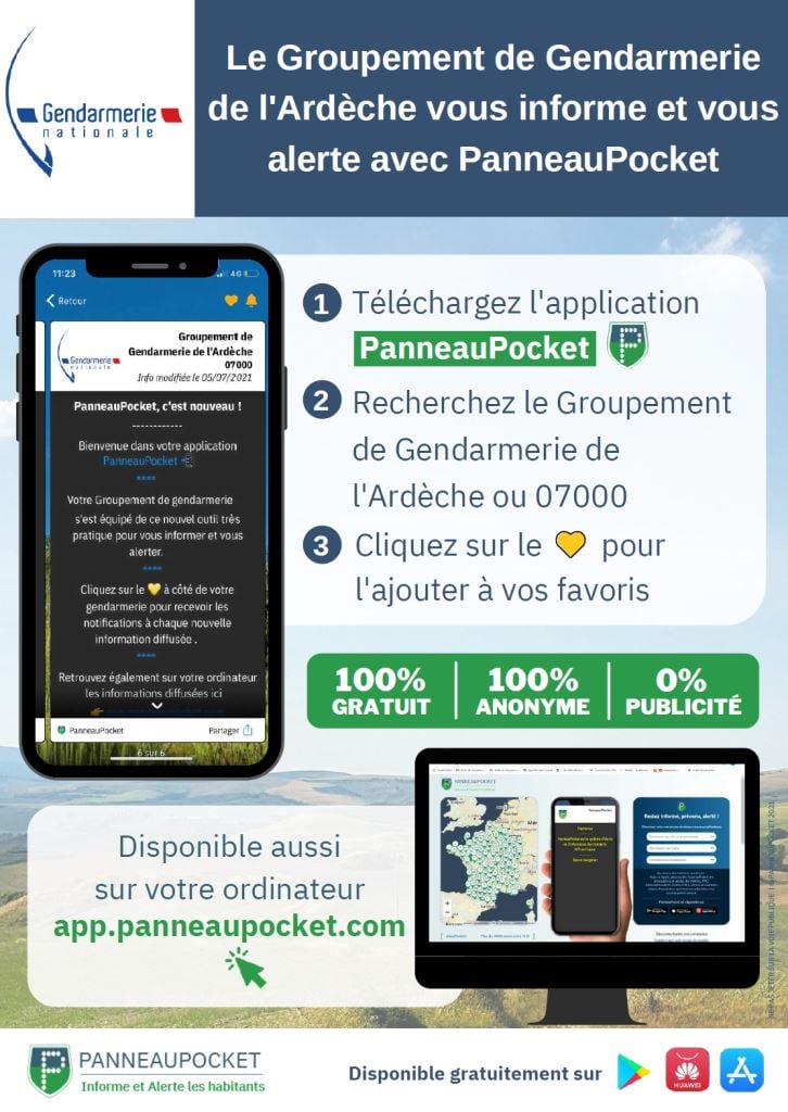 Les gendarmes de l'Ardèche informent via l'appli PanneauPocket 21 août 2021 Si vous avez l'application sur votre smartphone, vous pouvez vous abonner