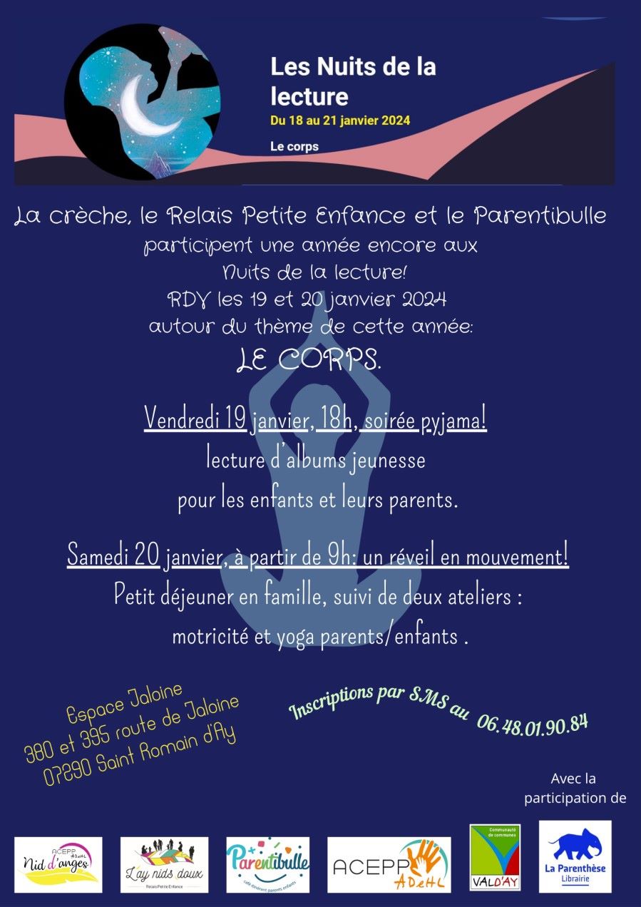 - Vendredi 19 janvier, 18h, soirée pyjama : lecture d’albums jeunesse pour les enfants et leurs parents.