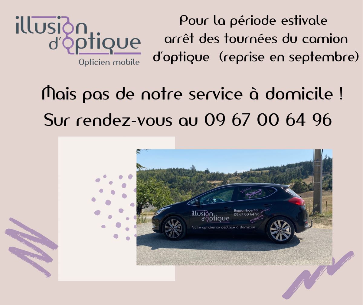 Pas de tournée d'Illusion d'optique en été 14 juin 2024 Service à domicile sur rdv Pour la période estivale, le camion Illusion d’optique arrête ses tournées, reprise en septembre. Le service à domicile est toujours disponible sur rendez-vous au 09-67-00-64-96
