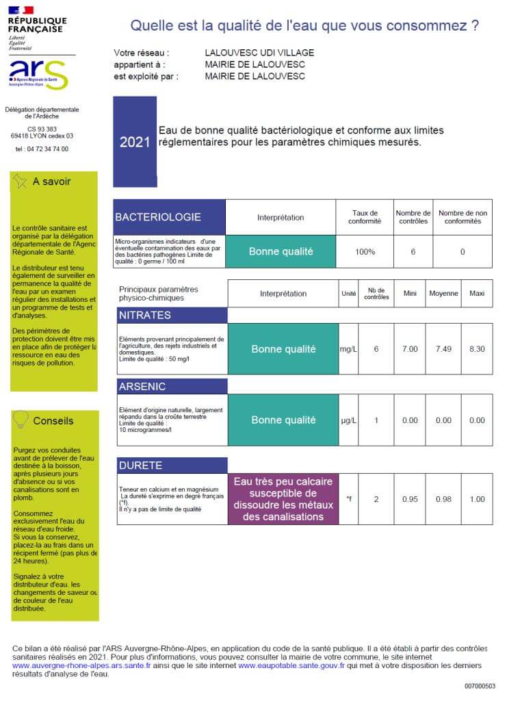 Selon l’Agence Régionale de Santé (ARS), l’eau de Lalouvesc était de bonne qualité bactériologique et conforme aux limites réglementaires pour les paramètres chimiques mesurés en 2021.