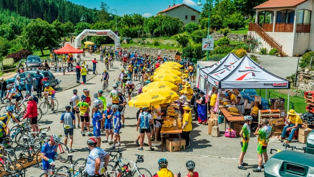 L’Ardéchoise c’est aussi le plus gros ravitaillement avant l’arrivée à St Félicien. Les bénévoles sont à pied d’œuvre toute la journée pour préparer, servir, réconforter, insuffler un peu d’énergie à ces courageux sportifs qui viennent de donner leurs dernières forces dans la montée du Col des Grands. Arrivés à Lalouvesc, enfin… parcours oh combien difficiles !, c’est à présent de la descente.