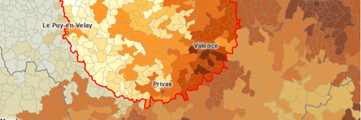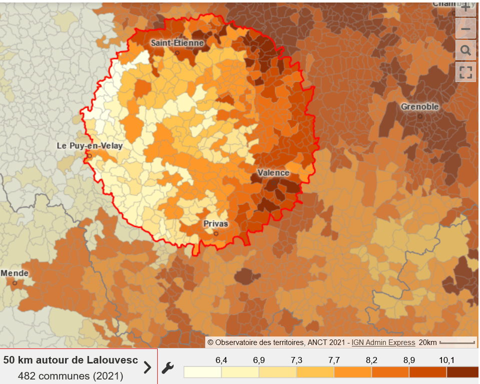 Voir ci-dessous les variations dans un rayon de 50 km autour du village. Lalouvesc est au centre du cercle.