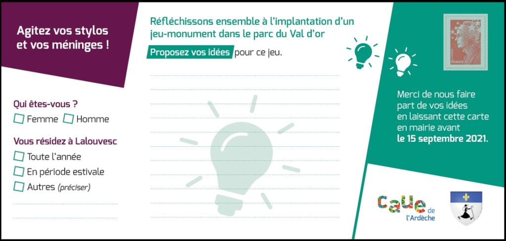 Pour récolter des premières idées et suggestions, une carte postale a été dessinée par le graphiste du CAUE. Elle sera largement distribuée tout le long de l’été. En la remplissant, vous pourrez ainsi déjà envoyer au Comité de développement vos propositions, en attendant une concertation plus approfondie.