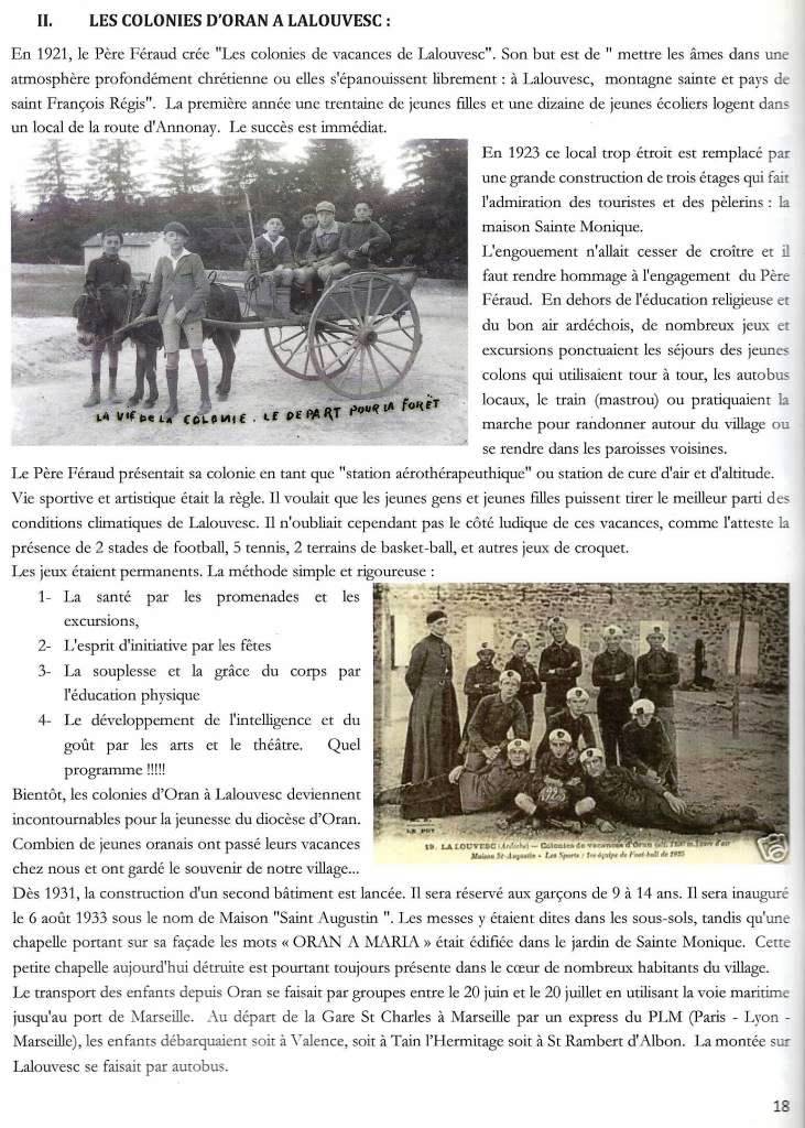 Le bâtiment Sainte Monique, rue de la Fontaine, est emblématique d’un passé révolu du village : un souvenir taillé dans la pierre, témoin de l’accueil en colonie de vacances de très nombreux enfants à la belle saison. Il a été construit à l’initiative du Père Féraud pour accueillir “les colonies d’Oran” dont l’histoire a été racontée par Jean-Claude Regal dans le n°4 de la revue de l’Alauda (2016) dont on pourra consulter un extrait ci-dessous.