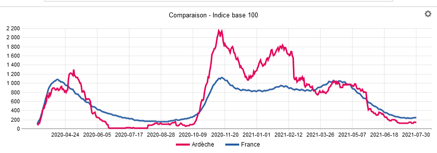 Chacun le sait, la pandémie continue à sévir en France et tout autour de la planète. La vaccination est essentielle pour atténuer les effets d’une quatrième vague de contagion qui malheureusement nous guette une nouvelle fois. 85% des personnes actuellement hospitalisées en France n’étaient pas vaccinées. Ci-dessous, l’actualisation de la courbe des tendances des hospitalisations en France et en Ardèche. On observe que la courbe a cessé de baisser. Il y avait 16 personnes hospitalisées en Ardèche au 30 juillet.