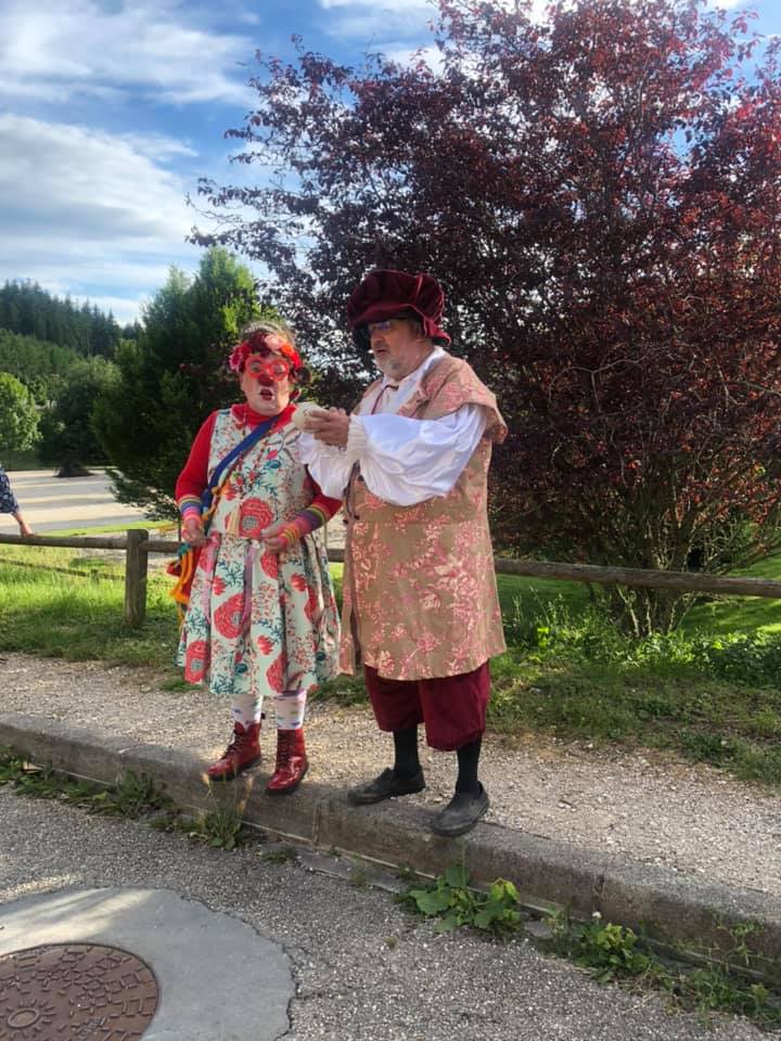 En avant-première, nous avons visité le Carrefour des Art, sidérant de beauté et d’originalité et par petits groupes nous sommes partis visiter les coins insolites de Lalouvesc. Les hauts de la Basilique et le musée St.Régis ont eu bien du succès. Puis tout s’est prolongé en chansons et en musique guidés par notre Groucho et son nez rouge. Tout le monde a joyeusement participé à cette collective chorégraphie. Nous sommes arrivés à l’Abri du Pèlerin dont le Père Barthe-Dejean a tracé l’historique. Fr. Brunel, président du Théâtre de la Veillée, en flamboyant costume du Malade imaginaire a présenté la troupe qui fête ses 4O ans.