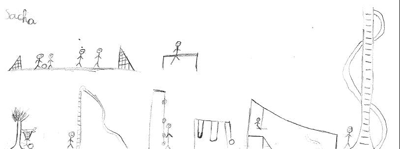 Alors, qu’est-ce qu’un jeu monument ? Je collecte leurs idées de jeux et de monuments… du côté « jeu », ça fuse, du côté « monument » c’est plus difficile. Nous imaginons ensuite comment allier les deux termes : ils travaillent en petits groupes à des propositions dessinées. Le matériau privilégié est logiquement le bois. Au-delà des jeux classiques (tyrolienne, toboggan, balançoire….) ressort aussi une envie de jeux de découverte de la forêt et de ses animaux (memory, quizz…) et d’un « coin calme ». Les cabanes perchées figurent dans la plupart des dessins.