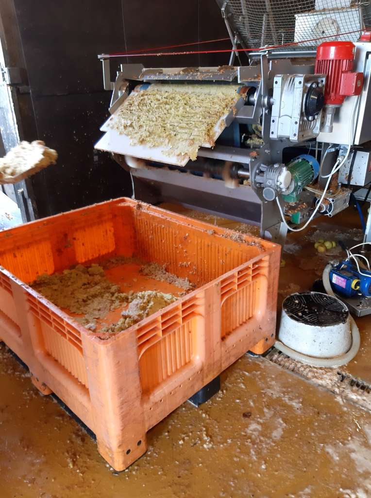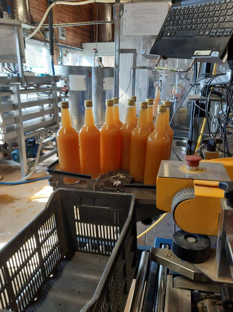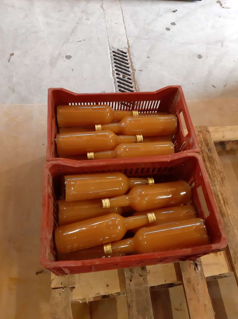 L’histoire débute même à Arlebosc. Nicolas Gamon, producteur de fruits, nous a offert une belle opportunité d’achat de 650kg de pommes. Merci à lui. Il a eu la gentillesse de livrer cette remorque remplie de jolis fruits directement à Pailharès dans les ateliers de Nectardéchois. Ainsi en quelques heures nos pommes se sont transformées en 350 litres de jus.