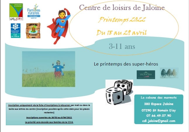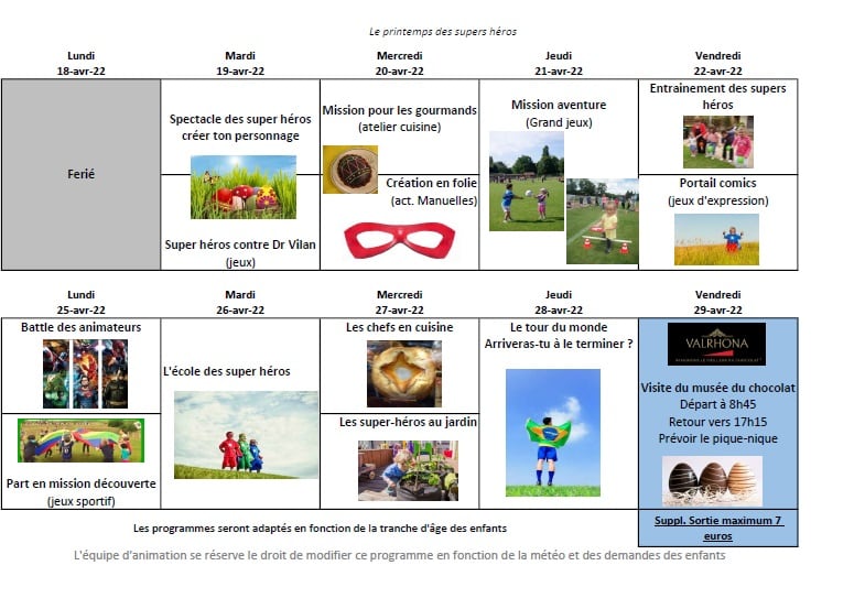 Pour ces vacances, les super-héros seront à l’honneur et ils devront participer à de nombreux challenges, sans oublier les activités manuelles et culinaires préparées par l’équipe d’animation…