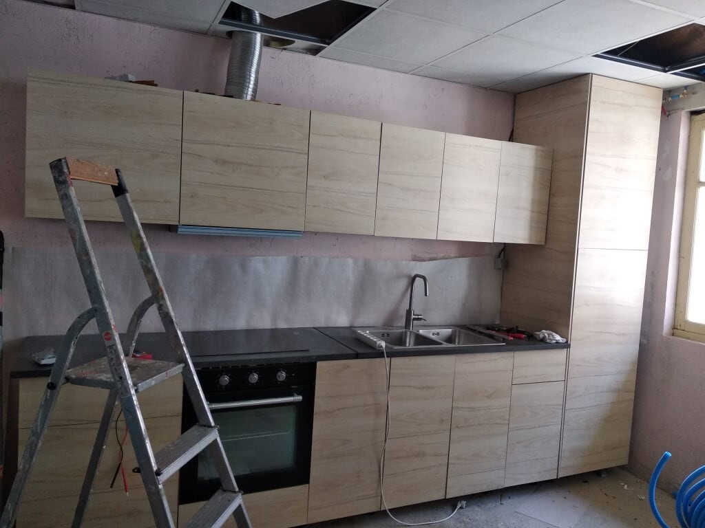 Le réfectoire aussi à fait peau neuve : installation d’une cuisine Ikéa, habillage de l’insert, nouvelle peinture, raccordement d’un lave-linge d’occasion…