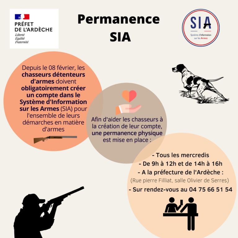 Depuis le 8 février, les chasseurs détenteurs d’armes doivent obligatoirement créer un compte dans le Système d’information sur les armes (SIA) pour l’ensemble de leurs démarches en matière d’armes, ou au plus tard le 30 juin 2023 en l’absence de nouvelles démarches, à l’adresse suivante : https://sia.detenteurs.interieur.gouv.fr