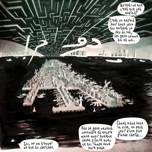 Félix travaille actuellement sur une bande dessinée Atlantis 2.0 dont le premier tome, déjà terminé, doit paraître cet automne, imprimé à Annonay. Ci-dessous une planche extraite de la BD :