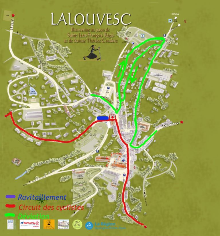 - tout le long du circuit des cyclistes (voir carte) ainsi que rue de la Fontaine et route d’Annonay depuis la Pharmacie jusqu’au chemin menant à la station d’épuration (déviation) le samedi 18 juin de 8h30 à 20h30.