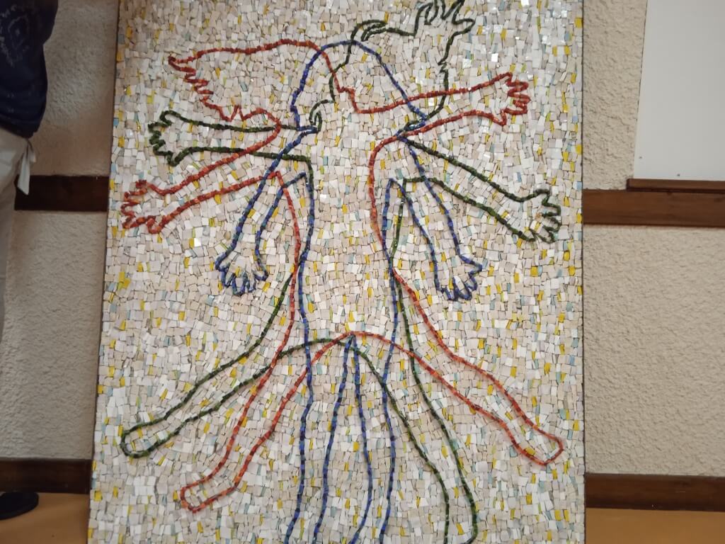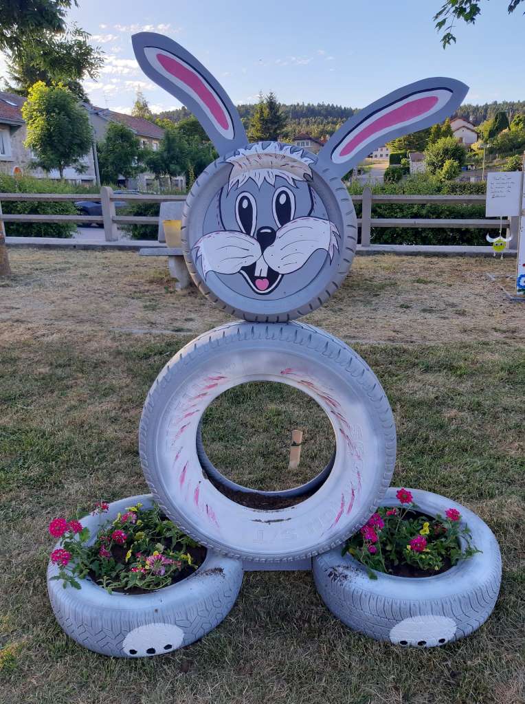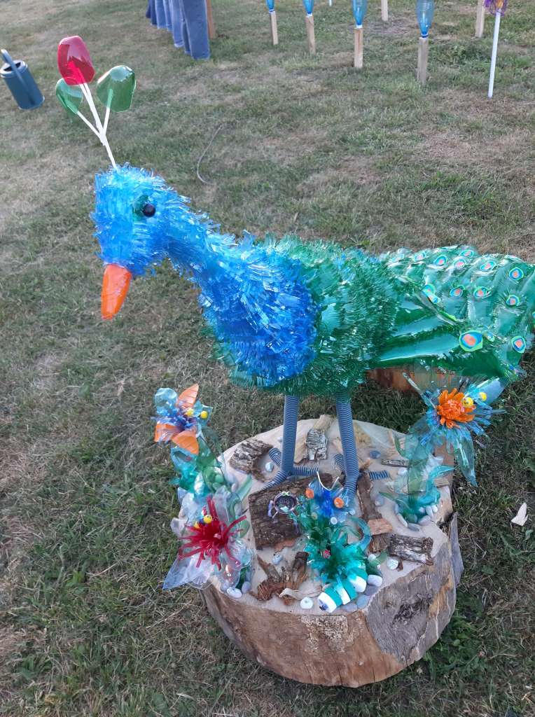 En effet lorsque vous achetez un jean au départ c’est pour vous habiller et non pour servir de pot de fleur. Des bouteilles en plastique sont achetées pour leur contenu (eau…) et aujourd’hui nous leur donnons une deuxième vie, transformées en fleurs, en paon, en robe, en décoration d’un chemin… Des capsules, des fonds de bouteille ont été récupérés pour réaliser un tableau qui nous renvoie dans un tourbillon imaginaire nous interrogeant « sur le devenir de notre planète ! ». Un rabat de wc destiné à la poubelle est passé entre les mains d’une peintre, le voilà souriant et étincelant de vieux CD. Des pneus usagers se retrouvent en lapin hilare. Des pots de lessive servent de pots pour plantes aromatiques. Des bouchons, des boites de conserve… deviennent des animaux : abeille, girafe…
