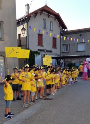Nos organismes sont très vite mis à contribution pour monter au village de Bozas, et ensuite direction Boucieu-le-Roi, et Colombier-le-Jeune, où nous attendait un accueil très chaleureux des élèves de l’école primaire. Ils brandissent une pancarte nous demandant de ROULER EN PAIX, c’est ce que nous allons nous efforcer de faire… Notre stress s’estompe et nous sommes plongés dans la merveilleuse ambiance de l’Ardéchoise.