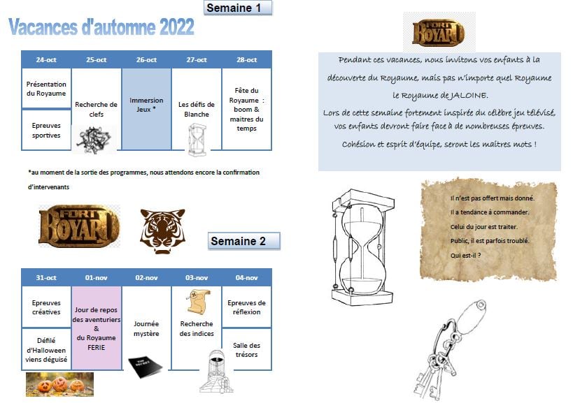 Pendant les vacances d’automne, les enfants de 3 à 11 ans sont invités à la découverte du Royaume, mais pas n’importe quel Royaume, celui de Jaloine. Lors de cette semaine, fortement inspirée du célèbre jeu télévisé, les enfants devront faire face à de nombreuses épreuves. Cohésion et esprit d’équipe seront les maîtres mots…