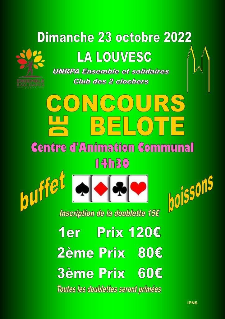 Le Club des deux clochers organise son concours de belote annuel le dimanche 23 octobre 2022. Toutes les doublettes seront primées. Cette manifestation amicale se déroulera au Centre d’animation communale.