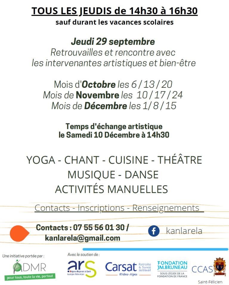 Le collectif KANLARELA est heureux de vous retrouver et vous propose son programme d’activités artistiques et de bien-être à destination des personnes atteintes de maladies neuro-évolutives, en situation de handicap ou d’isolement et à leurs proches aidants d’octobre à décembre 2022.
