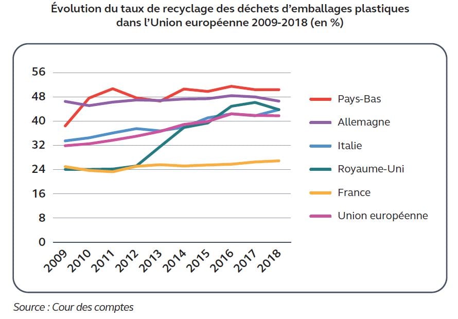 Un tout récent rapport de la Cour des Comptes montre que la France est en retard sur la gestion des déchets. Les objectifs affichés sont très loin d’avoir été atteints et le pays fait pale figure comparé à l’Allemagne, l’Autriche, les Pays-Bas…. La Cour dénonce notamment des acteurs « insuffisamment coordonnés », un dispositif de suivi « toujours défaillant » et un financement « peu lisible et trop faiblement incitatif ».