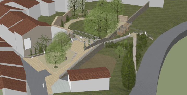 La rampe mène à l’étage inférieur où se trouve d’un côté un jardin potager où l’on pourrait installer le projet de “jardin idéal” de l’association “Les Jardins du Haut Vivarais” si elle le souhaite. De l’autre côté, accolé au mur de soutènement, se tient, bien sûr, le jeu-monument qui permettra aussi aux enfants de grimper directement dans le jardin supérieur.