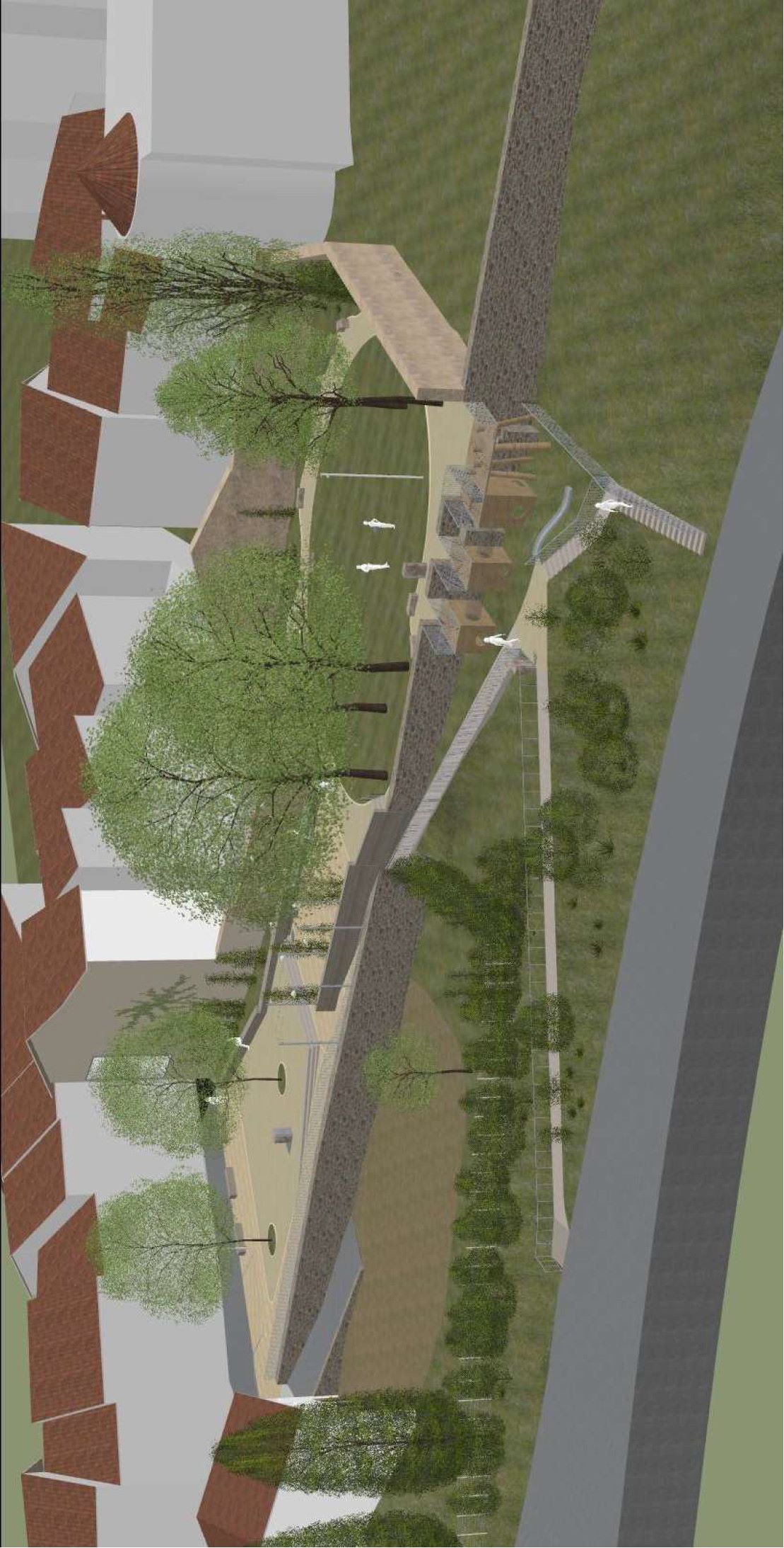 La placette sera réalisée en sol stabilisé, les circulations piétonnes principales en béton désactivé, y compris sur les rampes. Le jardin sera enherbé et planté d’arbustes en périphérie. Une treille suspendue entre la placette et le jardin, ménagera un espace ombragé où pourra prendre place du mobilier urbain.