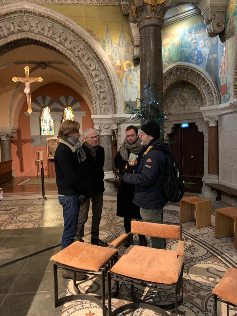 Jeudi 19 janvier, Le frère Yves Stoelen et l’équipe du Carrefour des Arts ont accueilli en la Basilique une délégation de musiciens : Gualtiero Dazzi compositeur, Christophe Galland récitant, Loïk Blanvillain chef de chœur, Thibaut Martin choriste et acousticien.