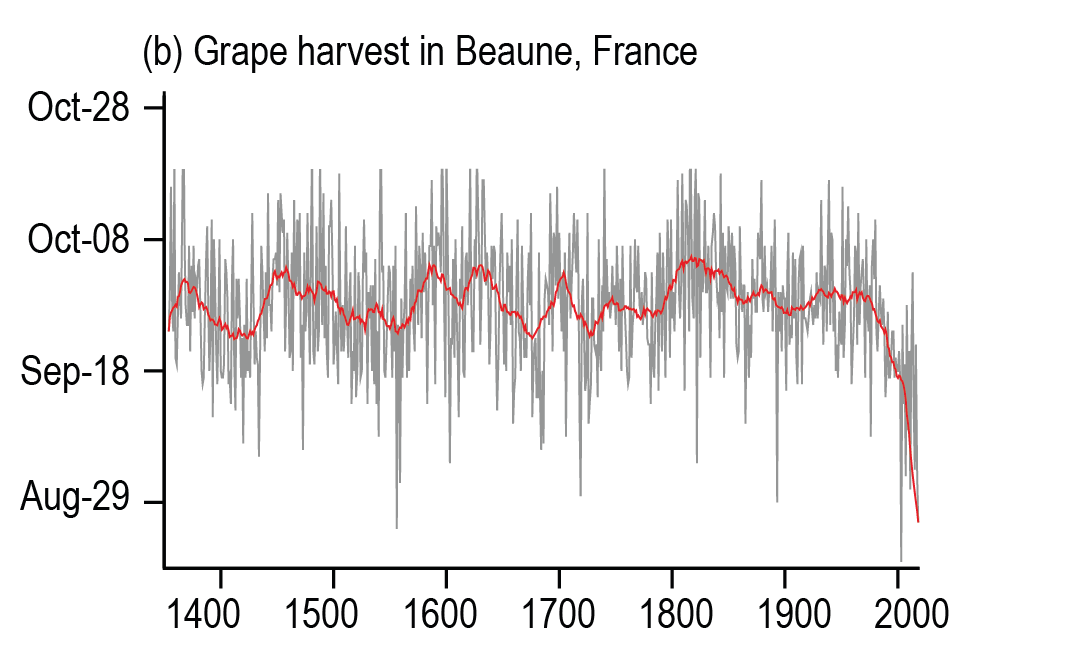 Un exemple l’illustrera mieux qu’un long discours. Depuis le 14e siècle les vendanges se tenaient régulièrement à Beaune en Bourgogne entre la fin septembre et le début octobre. La date est brutalement devenue plus précoce à partir de la fin du siècle dernier pour démarrer maintenant fin août, comme le montre le graphique ci-dessous.