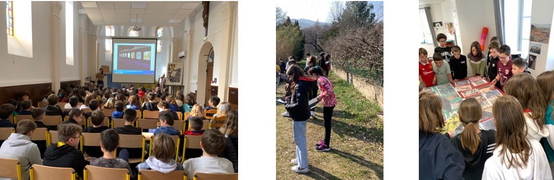 Première intervention en milieu scolaire ce printemps, deux artistes professionnelles, Judith Chancrin et Shasha Shaikh ont présenté leur démarche aux élèves de 6ème du Collège Saint Joseph en Val d’Ay et aux classes de CM1 et CM2 de l’école Saint Jean Baptiste de la Salle. Des ateliers créatifs durant le mois de mars 2023 avec les élèves : prises de photos d’inspiration dans la nature et création en dessins et peintures d’une œuvre « abstraite » inspirée par les photos. Les travaux des élèves seront mis en valeur par une exposition sur la place du marché de Satillieu du 6 au 30 avril.
