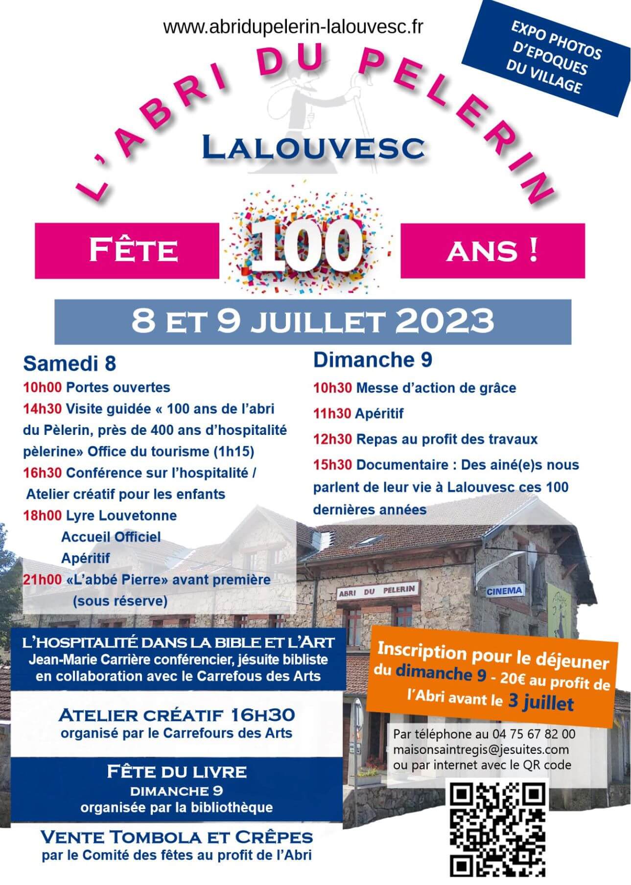 Les 8 et 9 juillet ce sera la fête à Lalouvesc. On célèbrera le centenaire d’une de ses institutions : l’Abri du pèlerin. Sous l’impulsion de la Maison St Régis, l’ensemble des associations locales ont coopéré pour organiser deux jours d’exception, comme on peut le voir sur l’affiche de présentation de la manifestation.