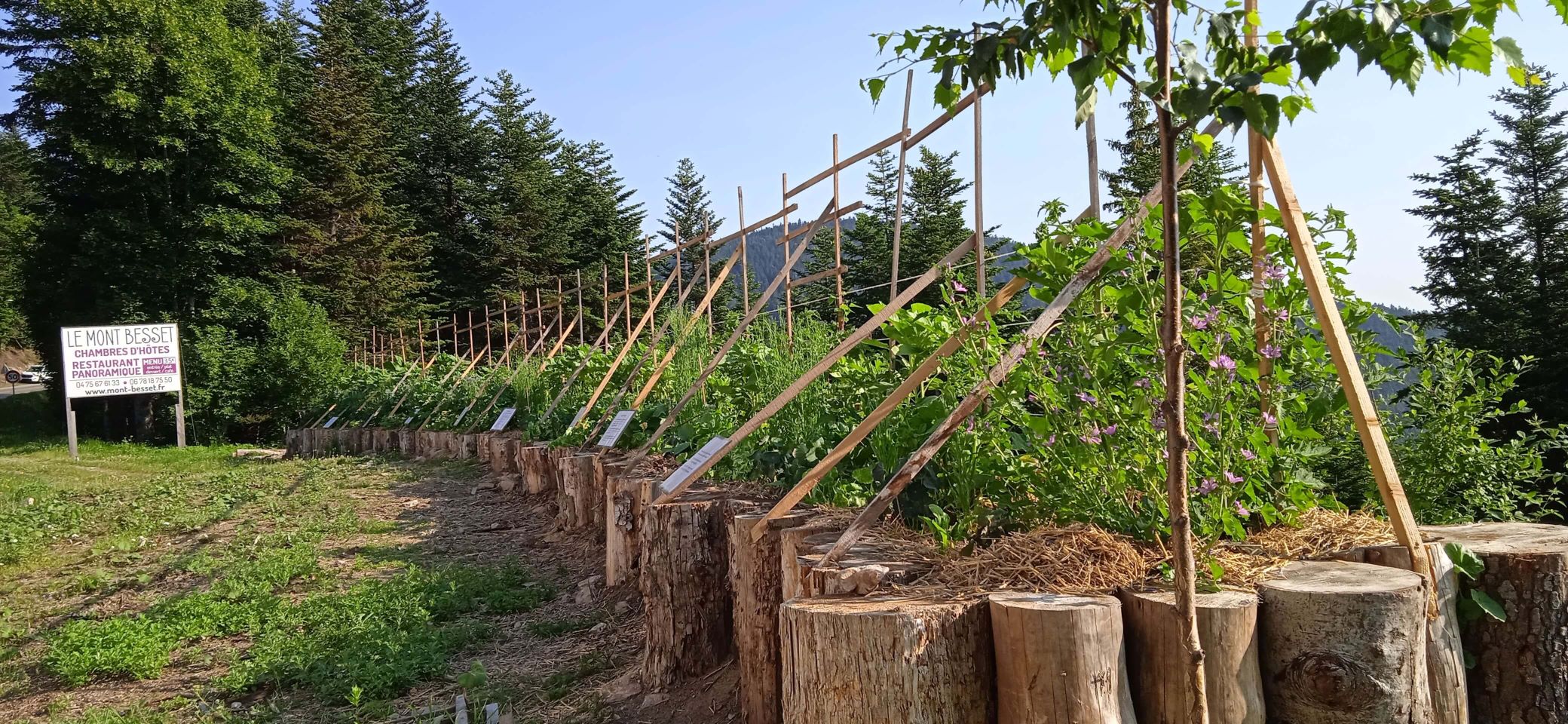 Les propriétaires du restaurant Le Mont Besset ont installé un jardin en permaculture le long de la route devant leur entrée. On peut y admirer des tournesols, des tomates et bien d’autres plantes. Il s’agit de démontrer par l’exemple l’efficacité de cette méthode, d’agrémenter l’entrée du village d’une plate-bande spectaculaire et aussi de faire une publicité pour le restaurant.