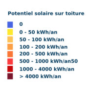Une carte, réalisée par les services de l’Etat peut nous y aider. Celle-ci répertorie sur toute la France le potentiel d’équipement en panneaux solaires des toitures. La carte est indicative, elle tient compte de l’ensoleillement et de la surface des toits, mais pas de l’état des toits, comme de la présence de chiens-assis, par exemple (tous les toits indiqués sur la carte ne sont donc pas éligibles). Malgré cette limite, c’est une aide précieuse. Voici donc ci-dessous le potentiel estimé de surfaces disponibles et donc de production électrique photovoltaïque du village.