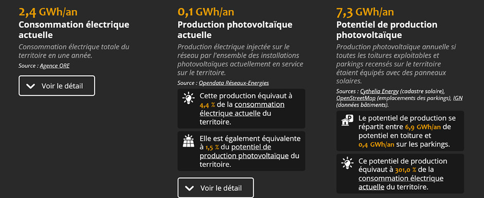 Dans cette perspective, il est intéressant de constater que la couverture complète de panneaux photovoltaïques du village produirait un volume d’électricité annuel très supérieur à la consommation électrique totale du village.