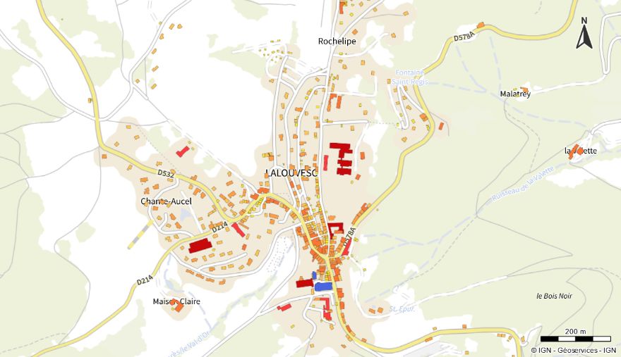 Une société a réalisé sur toute la France une évaluation du potentiel solaire des toitures et parkings, basée sur des données 3D et un calcul heure par heure prenant en compte les ombrages générés par la végétation, les bâtiments et le relief. Voici le résultat pour Lalouvesc :