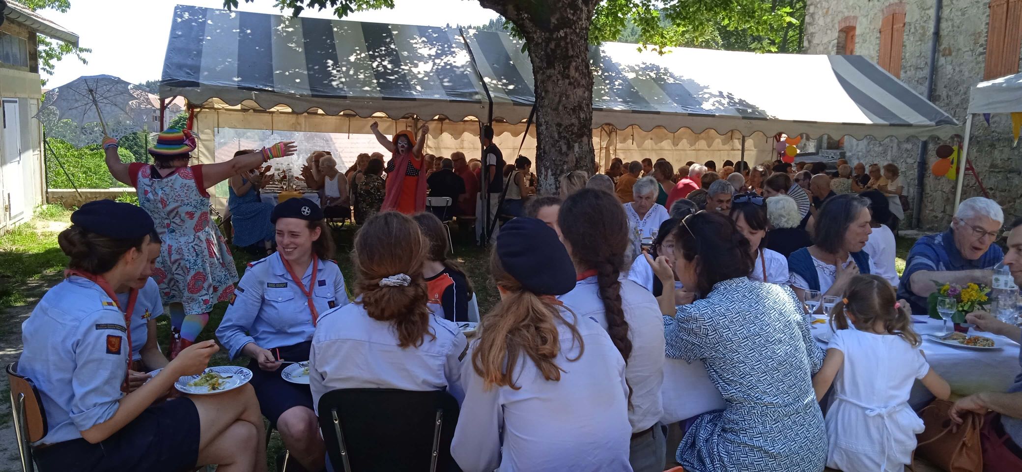 Et après, alors là !, un vrai banquet avec 130 convives dans la cour de l’Abri sous des tentes bien aérées, car il faisait bien chaud. Bravo aux organisateurs : tables magnifiques, bouquets de fleurs partout et repas succulent, en partie vietnamien (confectionné par les sœurs de Vinh le nouveau prêtre récemment ordonné à Lalouvesc).