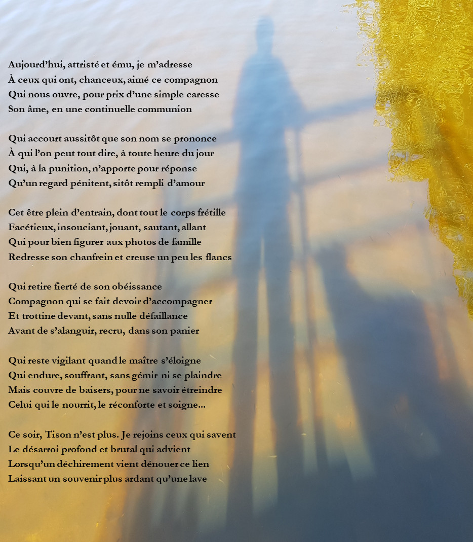 Lalouvesc a accueilli, pour le bonheur de ses vieux jours, ma chienne Tison (ainsi nommée parce que cendrée, et fille de Flamme.) Vous l’avez complimentée, caressée parfois. Je vous en remercie, souhaitant à tous de vivre cette relation unique, où affection et fidélité se donnent sans limite.