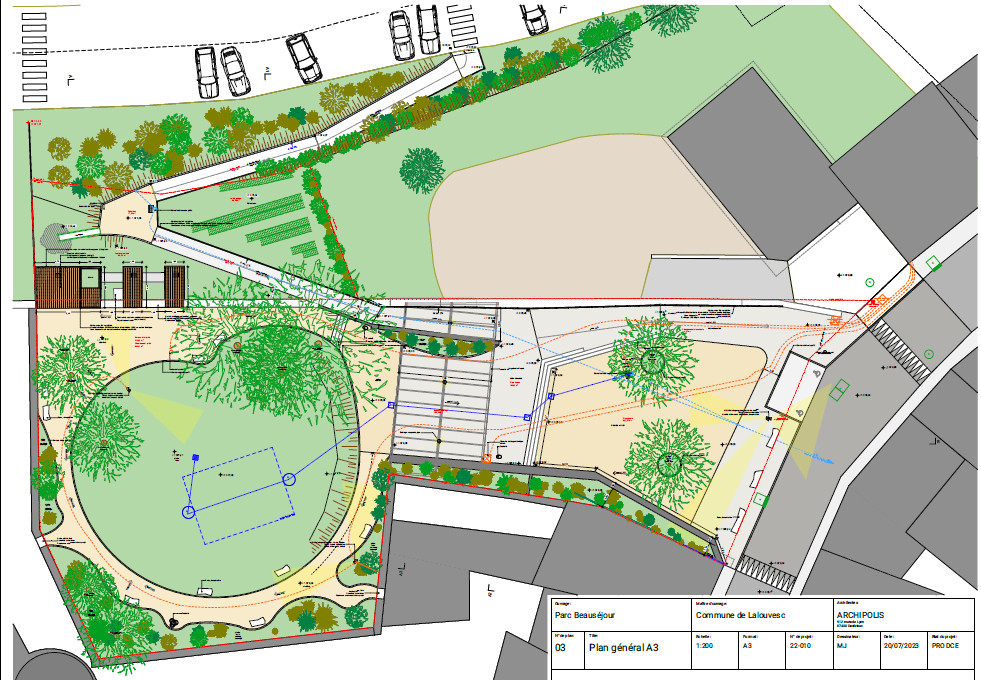 Le projet d’aménagement du parc est toujours le même, mais il devra subir quelques adaptations du fait de l’installation de l’Office du tourisme sur les lieux. Voici le plan tel qu’il est présenté dans le marché (attention, le plan ne comprend pas l’intégration de l’Office du tourisme, voir plus loin) :
