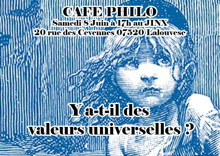 Le prochain café - philo se réunira au Jinx le 8 juin à 17h. Thème : Y a-t-il des valeurs universelles ? Ouvert à tous.